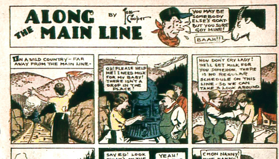 “Along the Main Line” in color, featuring the train engineer Ed and the stoker, Jake, has a new story that is simple and we trust, aimed at children. A woman waves them down and tells them she has no milk for her baby. They agree to help and luckily find a goat on the tracks who chases Jake back to the woman. The artwork is detailed but not fussy and the characters well drawn.