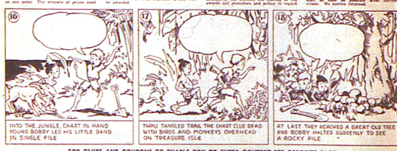 The big promotional piece is the “Join the Treasure Hunt Contest” which takes a full page and a coupon to send in at the bottom of another page. Dick Loederer’s original illustrations are still in use. W.C. Brigham drew the cartoons with blank balloons for the kids to fill in.