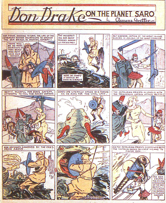 Steampunk enthusiasts should take a look at the continuing series “Don Drake on the Planet Saro” by Clemens Gretter and “2023 Super-Police” by Gretter and Ken Fitch. Both series began in New Fun #1. Originally Don Drake had both Gretter and Fitch bylines so perhaps Gretter is now writing Don Drake as well as illustrating.