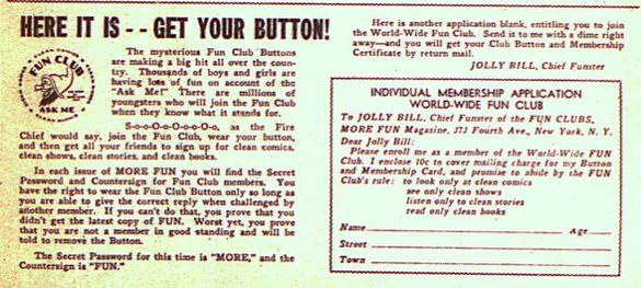 There are several ads throughout the magazine promoting More Fun and New Comics as well as the promotional ongoing contest. Here it is – Get Your Button! takes up the bottom of one page encouraging readers to join the World Wide Fun Club for a dime. Loederer’s Fun gnome continues being used in the branding.