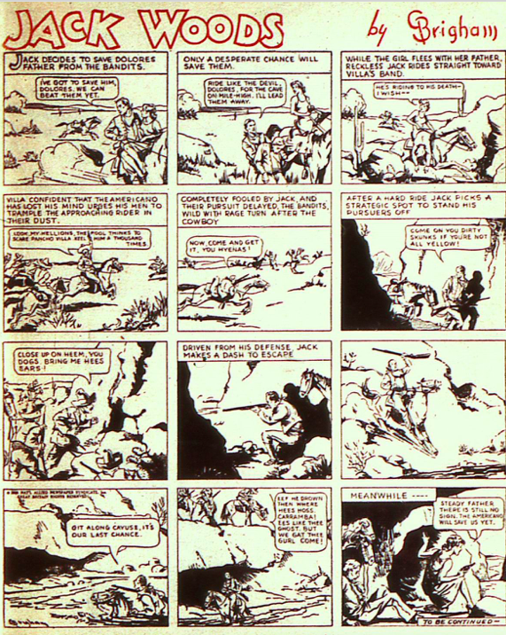 Brigham has two additional comics in the magazine. “Jack Woods” by “Brigham” in black and white, the ongoing story from New Fun #1, (January 1935) finds Jack rescuing Delores’s father.