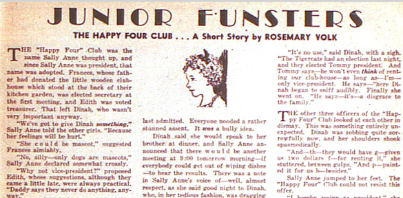 A second prose story appears on the page labeled “Junior Funsters” obviously aimed for younger children. “The Happy Hour Club … A short story by Rosemary Volk.” There is a small illustration most likely by Volk as well. A club is started by a group of young girls. They decide to give Dinah the job of Vice President because she is slow and fat and Vice Presidents never do anything anyway.