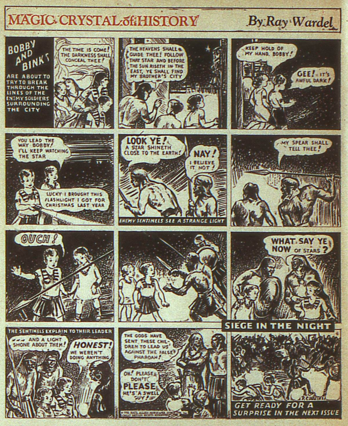 “Magic Crystal of History” in black and white by Ray Wardel (Wardell) continues the story of Bobby and Binks who have been transported to ancient Egypt and find themselves in the midst of a coup attempt.