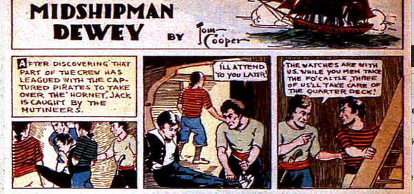 “Midshipman Dewey” in color by Tom Cooper continues the story of Jack, our young hero. He is caught by the mutineers who are in league with the captured pirates. They leave him tied up and begin to take over the ship. The pilot is knocked out and the last panel reveals the leader of the mutineers vowing to take care of the Captain next.