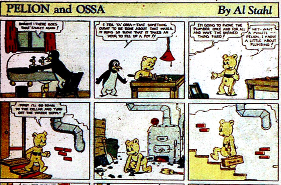 “Pelion and Ossa,” the continuing characters from New Fun #1 were written and drawn by Al Stahl in New Fun #6, More Fun #7 and now More Fun #8. This episode in color isn’t all that interesting. Ossa repairs the plumbing but mixes up the hot and cold water. The artwork is solid and appealing.
