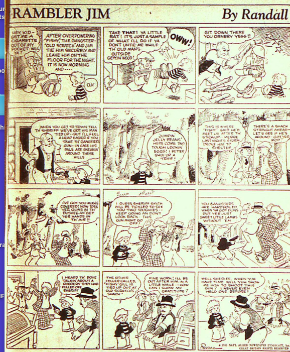 Randall’s other comic in black and white, “Rambler Jim” I find more interesting. The story is intriguing and the characters likeable. It’s also very much of the period with gangsters who have “rods.” The gangster tied up at Fishy’s shack asks young Jim for the cigarette in his pocket. When Jim gets near him, the gangster kicks Jim. Fishy comes to the rescue and smacks the gangster on the head with a log. He then sends Jim into town to tell the sheriff and gives Jim the gangster’s gun.