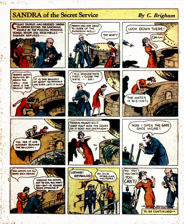 “Sandra of the Secret Service” by C. Brigham (William Clarence Brigham, Jr.) in color continues to occupy prime real estate as the first page of the comic. The script is most likely the Major’s.
