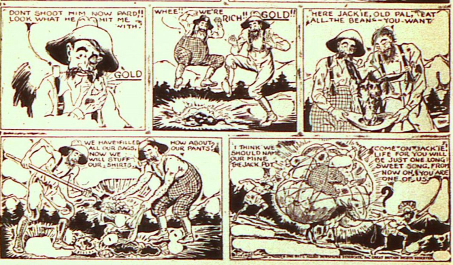 [A Mystery Solved] The other non-fiction comic in black and white is “A True Story of How a Mother-Lode was Discovered.” The small indistinct signature has a g in the center of the name that is similar to Livingstone’s and the artwork is also similar. It is also similar to what appears to be a signature in Ivanhoe. I checked with a collector who has an original More Fun #8 and he confirmed that Ivanhoe and this comic are both signed by Livingstone. The story is simple about two prospectors who have a mule that kicks a lot and throws up a gold nugget that turns out to be the clue to the motherlode. According to the “Quarterly Illustrator” of 1894 Livingstone spent some time in California in the Sierras so that would also lend credence to his being the artist and writer of this comic.