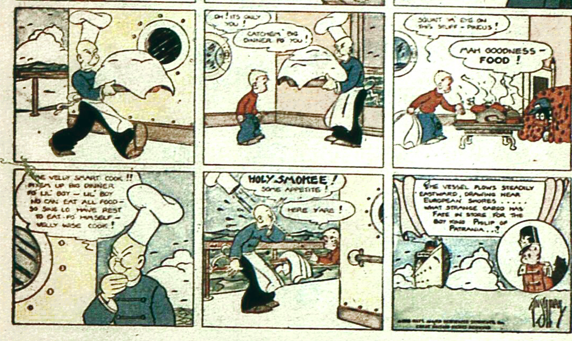 Slim takes the gorilla to a café to feed him but the guy behind the counter isn’t thrilled by a gorilla and pies are thrown. The police are called and the last panel is of Slim sitting under a tree being fed pie by the gorilla. The story is simple and silly. The artwork is consistent with the style of the period and follows a standard newspaper format.