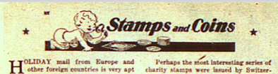 “Stamps and Coins” has a slightly altered logo from the Dick Loederer illustration and no longer carries his initials and there is no byline. The full-page article contains information about charity stamps and half-dollars.