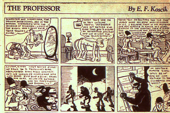 “The Professor,” a recurring comic in black and white by E.F. Koscik resumes the saga of the Professor attempting to outwit the crooks who are trying to steal his formulas. In this episode the Professor dons a monkey costume to fool the crooks. They send a real gorilla to kidnap him—why a gorilla is not clear—but the gorilla falls in love with the fake monkey/Professor.