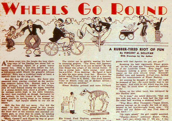 The prose story needed for second class postal rates is “Wheels Go Round, A Rubber-tired Riot of Fun” by Vincent Sullivan with drawings by the author. The title is in red in a panel across the top of the page including drawings.