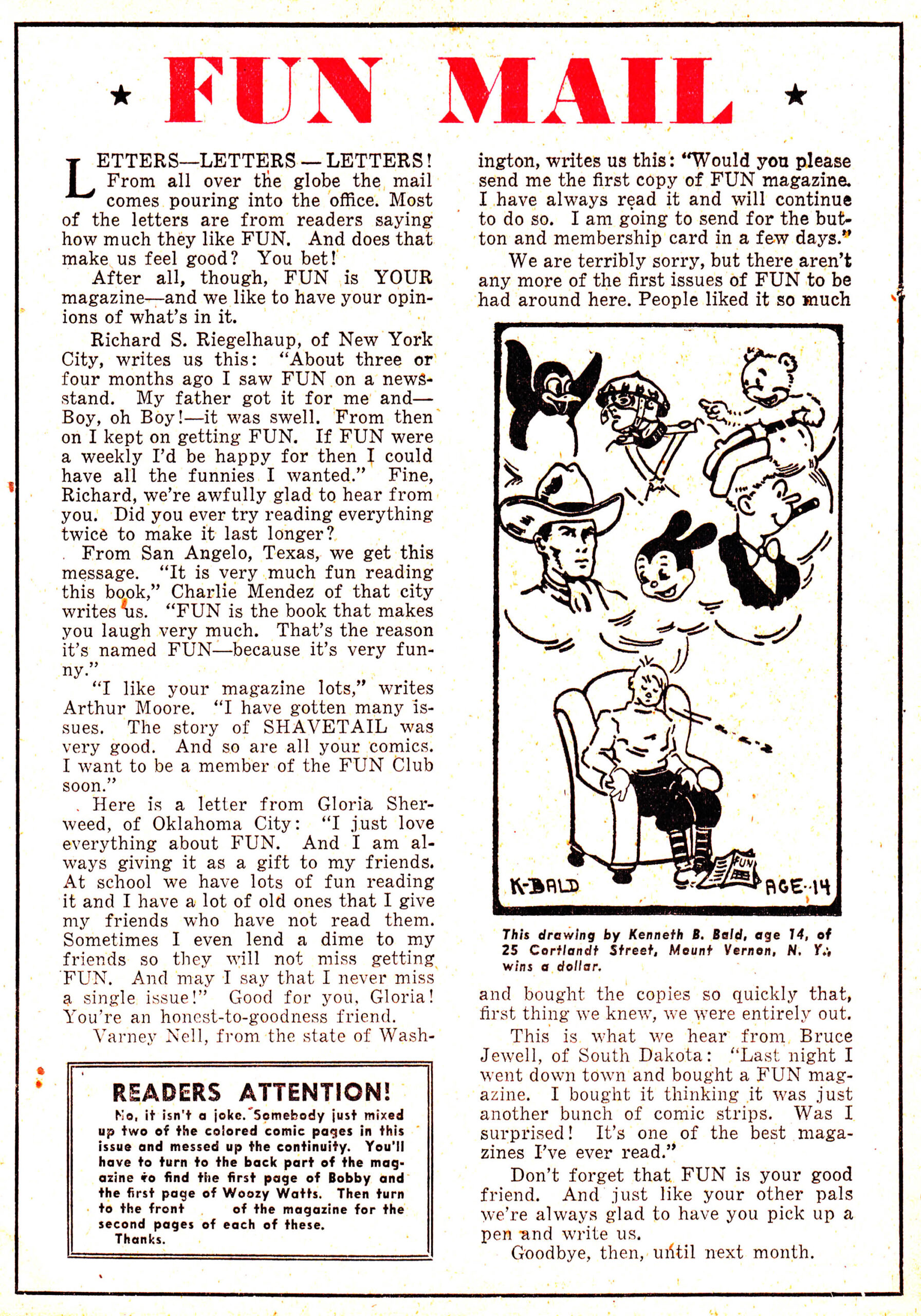 The regular feature “Fun Mail” is one page with a drawing by 14-year-old K. (Kenneth) Bald that is quite good. One reader wants the first issue of Fun but is told there aren’t any more issues. That’s an interesting remark, if true meaning they sold out or if not why were they not available?