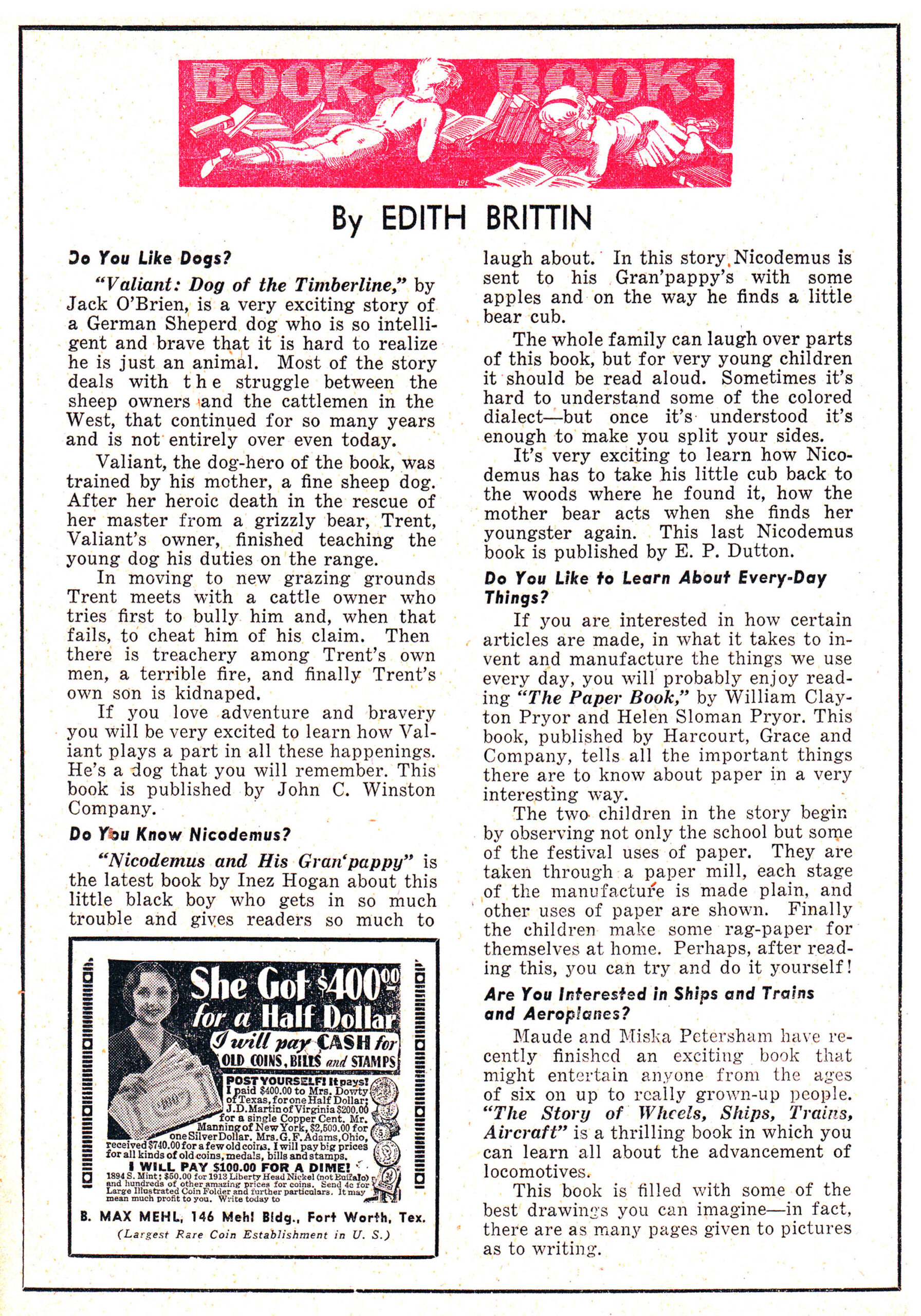 “Books Books,” a regular feature, is by Edith Brittin on one page with the original title illustration by Dick Loederer in red. Several books are discussed including one called “Nicodemus and His Gran’pappy” by Inez Hogan.