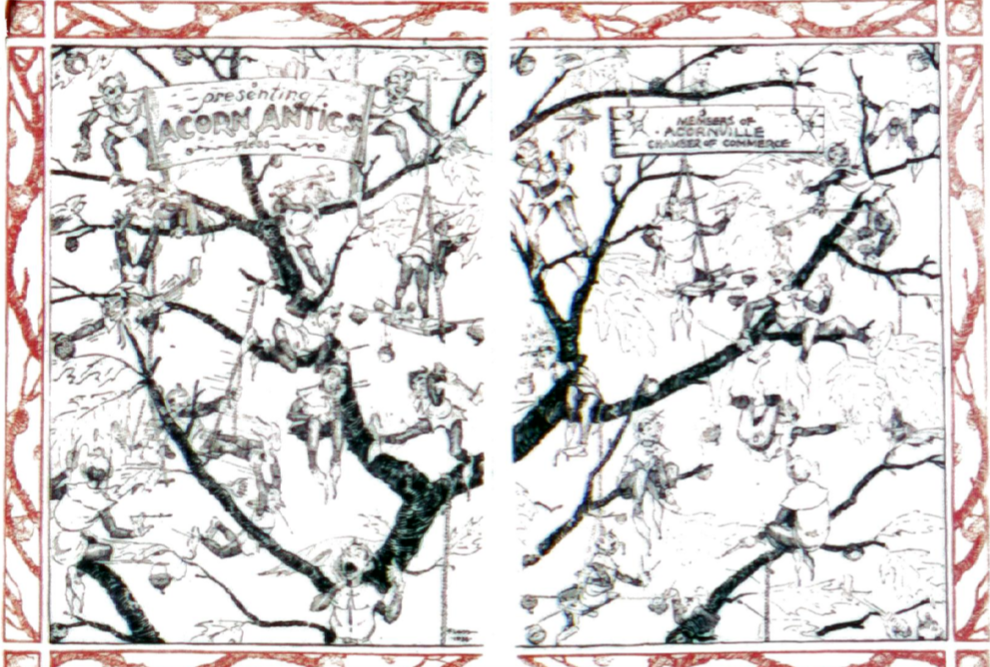 And for the first time Creig Flessel as Fless appears with a two-page splash, in black and white with a red border, “Presenting Acorn Antics.” It’s too bad I don’t have a better image as this is an intricate drawing with various elves in a tree. There is sly humor in the sign, “Members of Acornville Chamber of Commerce.” Flessel’s playful side is apparent and he is clearly a skillful artist. All the faces and there are a lot, have different expressions. It’s going to be fun to see his art develop over the next issues.
