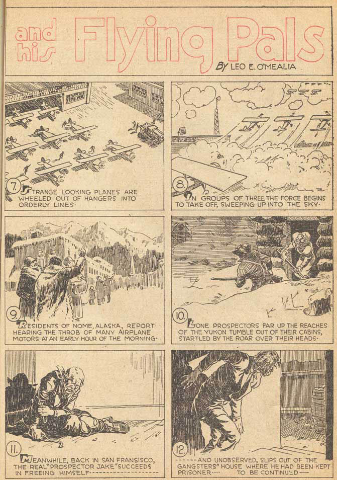 O’Mealia also continues with “Bob Merritt and his Flying Pals” for two pages in black and white. At the top of the second page is the title “Gentleman Adventurer and Inventor.” Some of the comics don’t fare as well in black and white but O’Mealia’s ability is such that the story looks great in black and white, probably because he got his start in newspapers.