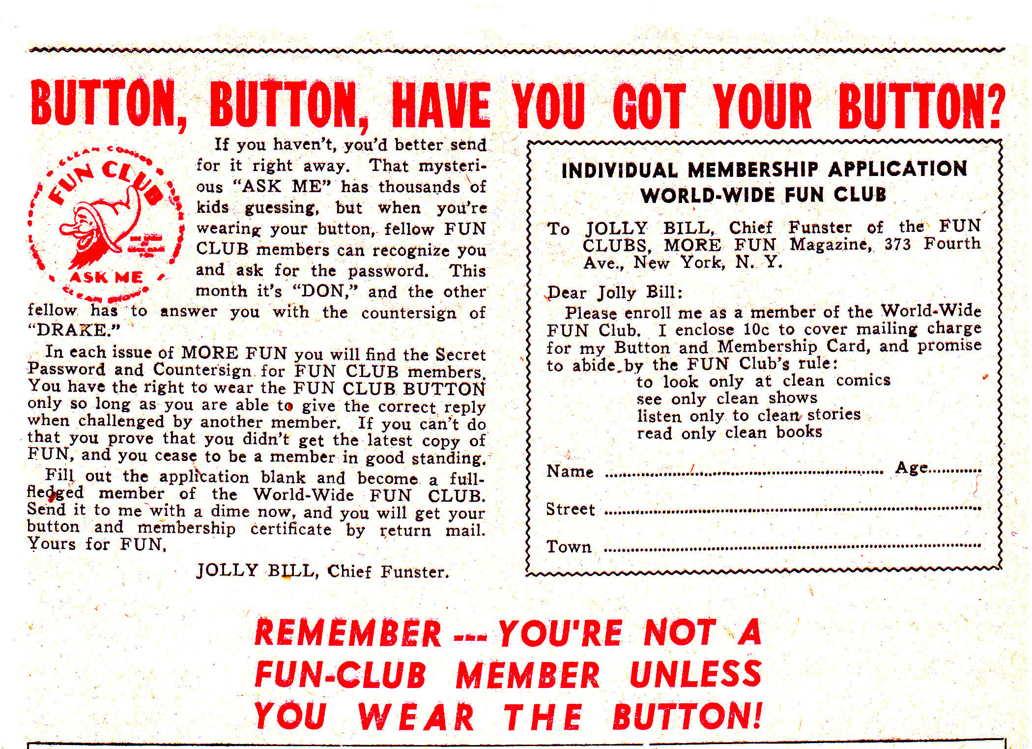 Button, Button, Have you Got Your Button? takes up half a page with an application for the Fun Club. The Dick Loederer Fun gnome illustrates. Jolly Bill continues to urge kids to join for a dime. The secret code for this month is “Don” with the answer “Drake,” the main character from “Don Drake on the Planet Saro.” We’re told that–You’re not a Fun-Club member unless you wear the Button! The second half of the page has the Treasure Hunt coupon and clues and also costs a dime to enter the contest.