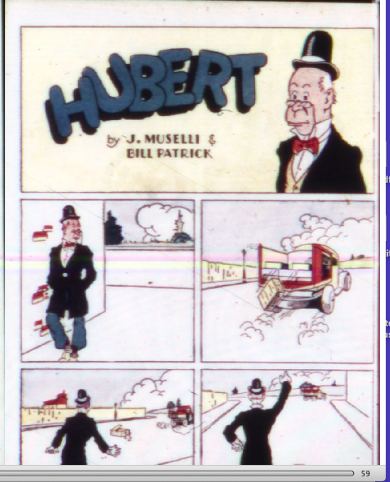 “Hubert” by J. Muselli and Bill Patrick appears for the first time with two pages in color. It’s an unusual comic, almost surrealistic. There is no dialogue. Hubert, a sort of British Buster Keaton type sees a box of magnets fall off a truck. He puts them in his pockets and when he passes by a construction area with a huge steel beam it picks him up. The character is interesting and the artwork is well-done with strong pencils.