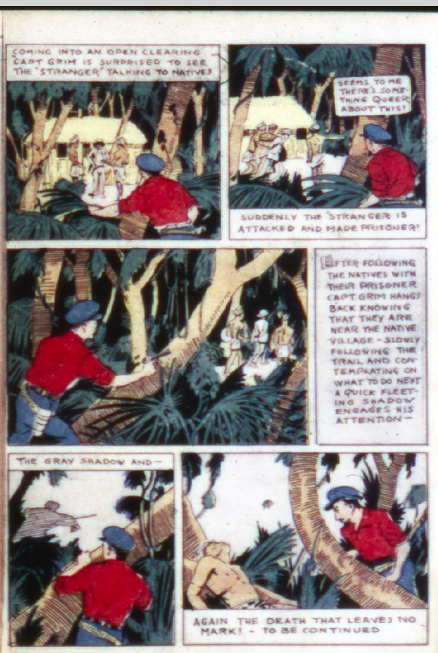 Cooper as MacFergus continues “In The Wake of the Wander” with two pages in color. It is a continuing story and has a similar plot line to “The Spanish Dubloons,” a pulp adventure story of the Major’s. Captain Grim jumps from the burning building and lands on top of a stranger. Grim follows the stranger and sees the natives take him prisoner. On his way back, he finds another person dead from the death that leaves no mark.