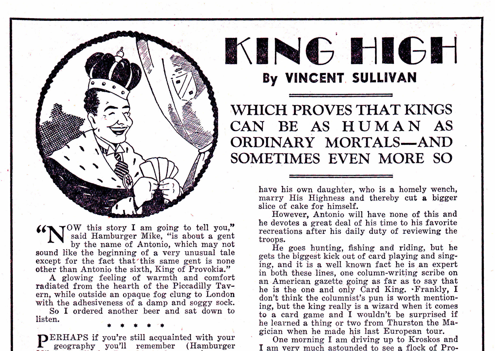 He suggests to Chico the Turk that he has a prize beyond any money possible. They play cards and he allows Chico the Turk to win and proceeds to give him his kingship to Provokia. Everyone ends up happily ever after. Although it’s well written, it’s not a sophisticated story. Like Sullivan’s story “Wheels go Round” it would be better as a comic.