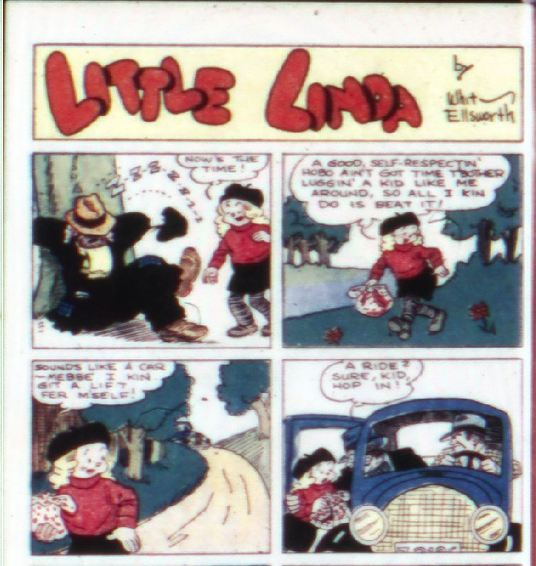 Whit Ellsworth’s continuing story of “Little Linda” is two pages in color. Little Linda, a sympathetic character, has left her hobo friend and gets picked up by a couple of bank robbers who take her to their hideout. The cops have circled them and Linda must do something to save the day. Ellsworth’s storytelling ability is evolving leaving us wanting to know what happens next.