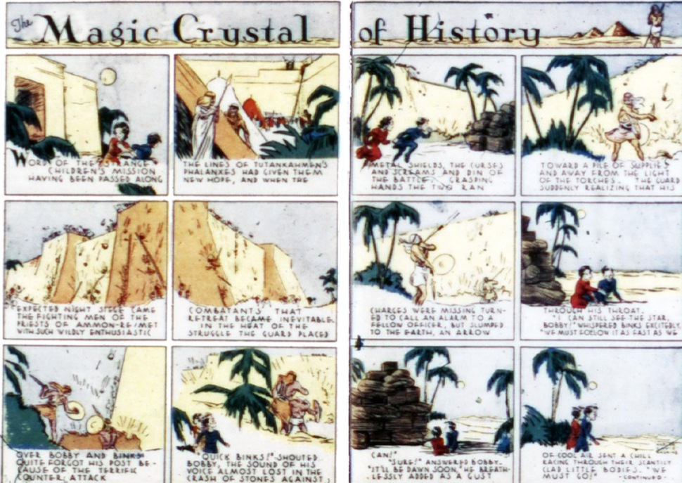 Harlan (Harlan David Haskins) took over “The Magic Crystal of History” with two pages in color. The artwork is attractive with desert scenes and the story is told more poetically in the classic style with dialogue and narration at the bottom of the panel. Bobby and Binks are still in Egypt and captive. During the fight they manage to escape and head into the desert.