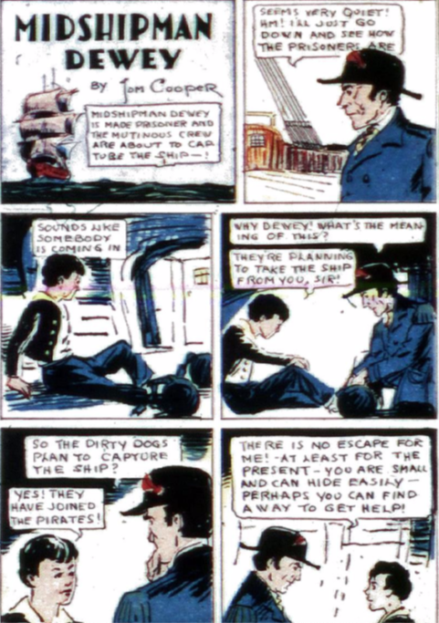 “Midshipman Dewey” originally by Adolphe Barreaux, then taken over by Richard Loederer and now in Tom Cooper’s hands beginning in More Fun #7 continues with two pages in color. The captain hasn’t been captured by the pirates and doesn’t seem to realize what’s going on. He finds Dewey who tells him what has happened. The pirates find the captain and he is now their prisoner. They head the ship toward a group of islands and Midshipman Dewey escapes. It’s an okay story but the artwork is solid.