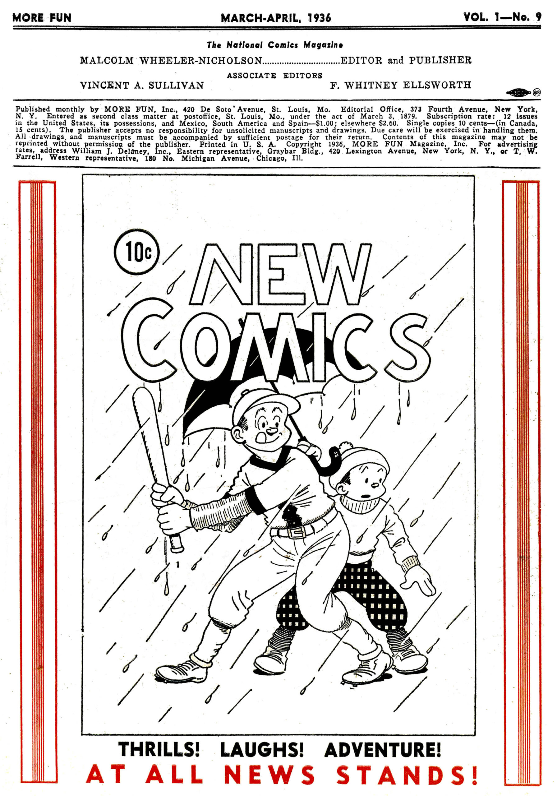 The inside cover masthead no longer has William H. Cook as Managing Editor or John F. Mahon as Business Manager. Malcolm Wheeler-Nicholson is listed as Editor and Publisher with Associate Editors–Vincent A. Sullivan and Whitney Ellsworth. The National Comics Magazine is above. Note that New Comics is titled as the International Picture Story Magazine. I’m not sure why the distinction.