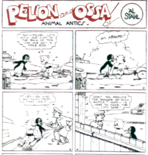Al Stahl continues the adventures of “Pelion and Ossa” Animal Antics with two pages in black and white and a red title. Pelion and Ossa hitch their sled to a car to get a free ride. A policeman stops them and starts to untie the sled but the car takes off. The policeman goes on a wild ride and the chief catches him and admonishes him with the same speech the policeman gave Pelion and Ossa. The police characters are human and don’t seem to notice that the “kids” are animals.