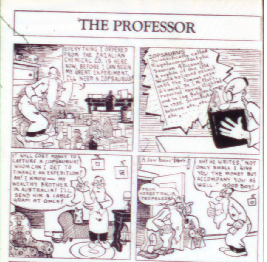 This story is more interesting than the others and not as silly. The drawing style is quirky and illustrates the characters well. However, this was Koscik’s last contribution so we don’t find out what happens. A version of the story appeared in Funny Picture Stories June 1937 as Professor Joshwink in a quest for the Zozosaurus.