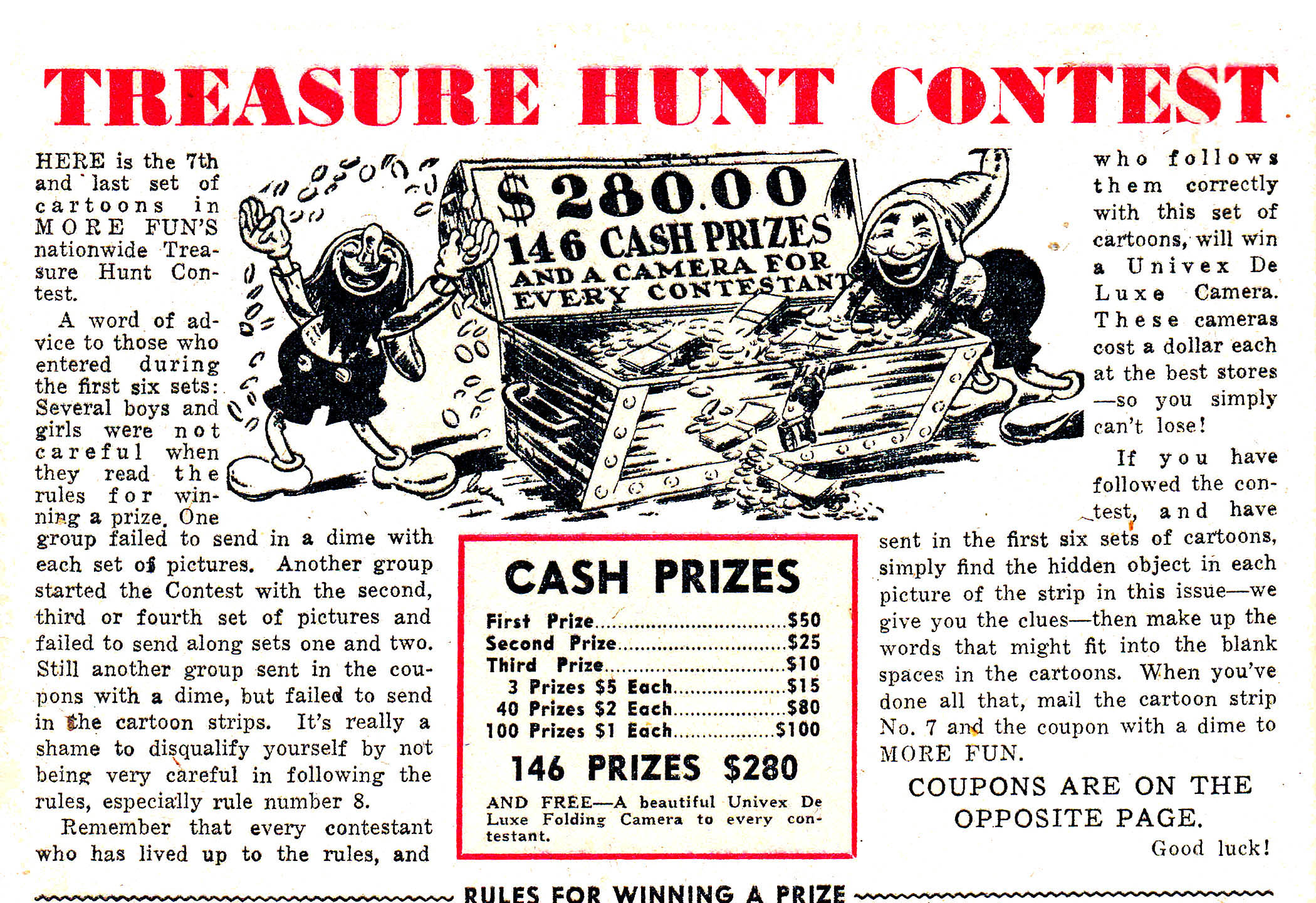 There are three, possibly four additional promotional pieces in More Fun #9. The Treasure Hunt Contest takes up a full page. It began in New Fun #3 and appears for the final time as planned. The Fun gnome by Richard Loederer continues to illustrate and W.C. Brigham continues to draw the cartoons. The content seems to be the same.