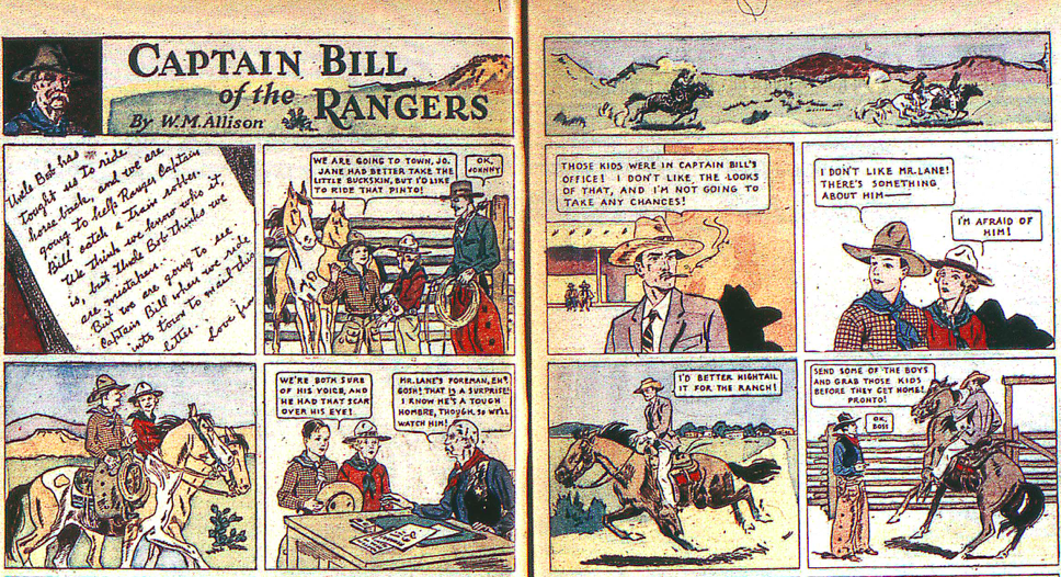 The first two-page comic, “Captain Bill of the Rangers,” is by W.M. Allison (William Merle) in color. It continues the story of Jim and Jane visiting their Uncle Bob out west. They recognize the train robber and go into town to tell Captain Bill. Mr. Lane from the ranch next door follows them into town, asks them to come visit his ranch and has his men kidnap them as they ride back to their Uncle Bob’s ranch.