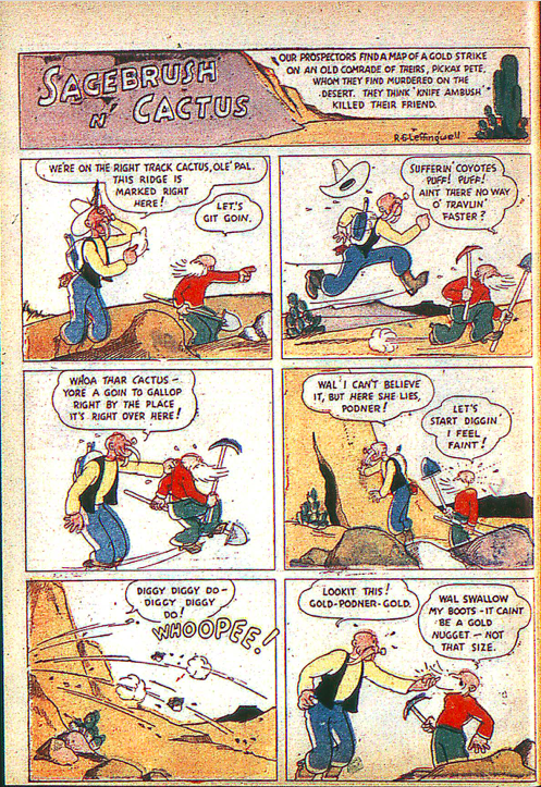 My favorite of Leffingwell’s comics “Sagebrush and Cactus,” is the continuing story of the gold miners–Sagebrush and Cactus. In this chapter they find the mine of gold, hide the entrance and head for town. The dialogue and illustrations provide a pretty good clue of what will happen and I look forward to the next installment.