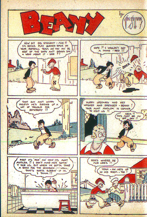 “Beany” makes his second appearance in color in a two-page comic by Vin Sullivan. The character and storyline are similar to Jibby Jones. Beany gets into a fight with the local bully. He comes home and has to take a bath because his aunt is coming to visit. The bully and his henchman put a ladder against Beany’s house and throw rotten tomatoes at him after he is clean and dressed. Beany comes downstairs to meet his aunt covered in rotten tomatoes.