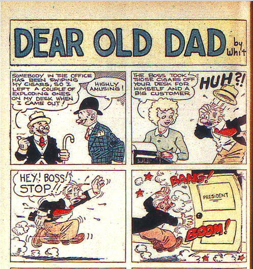 “Dear Old Dad” by Whit is a one-page comic in color. This storyline has a more solid joke. Dad leaves exploding cigars on his desk because someone has been taking his. The boss and a new client help themselves with the unsurprising results. In the last panel Dad is seen at the Employment office.