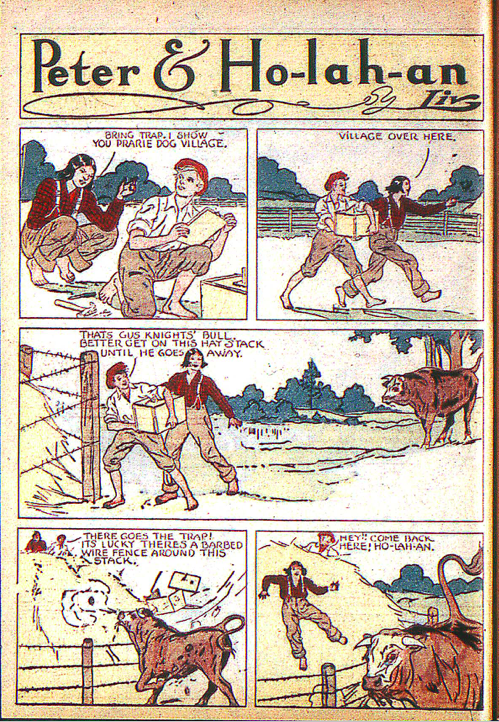 Both are two pages each and in color. In this episode of “Peter & Ho-Lah-an,” Ho-lah-an tells Peter that he has a trap to catch a prairie dog. They reach the prairie dog village only to have the farmer’s bull chase them. Ho-lah-an pulls the bull by the tail and the bull tries to run away.