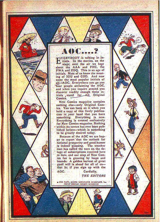 “New Comics magazine contains nothing else—Only Original Comics. You can bank on it when you hold a copy of this lively publication in your hand that you are getting something. Everything is new. Everything is created exclusively for New Comics magazine. Nothing within its covers has ever been published before—which is something to be greatly desired today.”