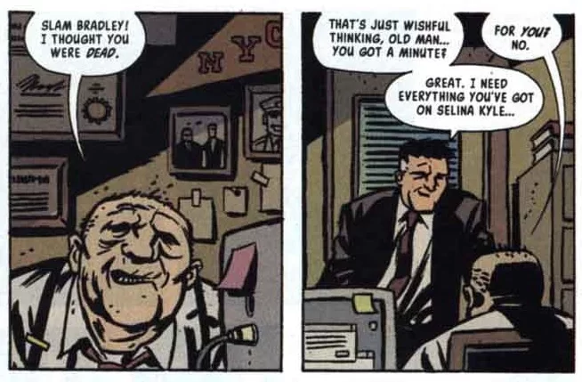 In Detective Comics #759 August 2001, Ed Brubaker as writer and Darwyn Cooke as artist resurrected Slam as a more noir character in a four-part series, “Trail of the Catwoman.” Slam is hired by the mayor of Gotham to find out if Catwoman has died or is still living. Slam is older and jaded. He’s seen some of the worst of life and it shows.