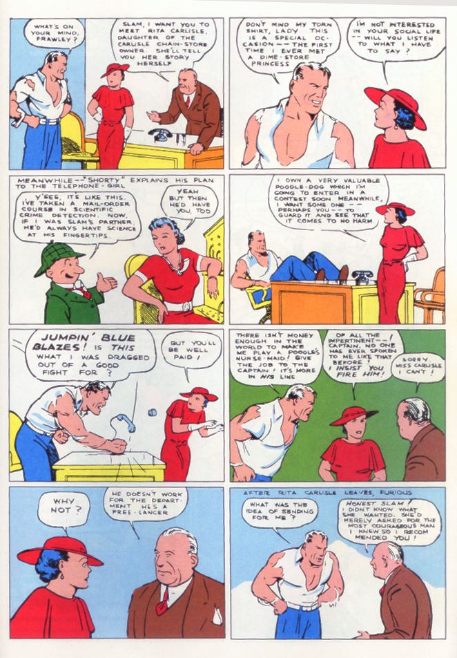 In the original Siegel and Shuster stories beginning in Detective Comics #1, March 1937 and continuing through the Major’s period to Detective Comics #13, March 1938, the plots were simple with a villain or two and the ability of Slam to both outsmart the bad guys and overcome them physically.